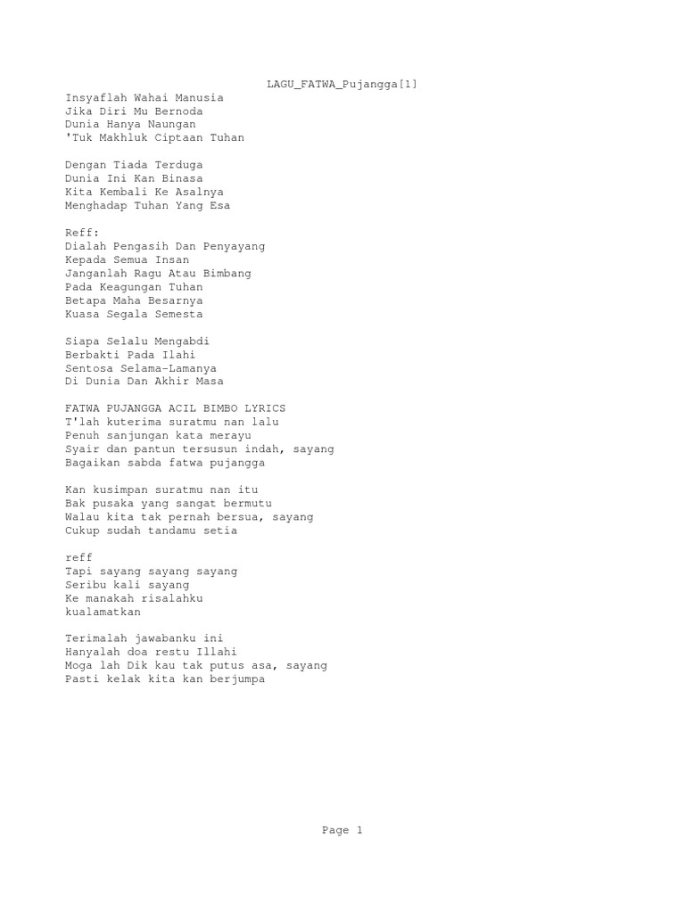 Lirik Lagu kenangan Fatwa Pujangga Di populerkan oleh Aishah Telah kuterima suratmu nan lalu Penuh sanjung dan kata merayu Syair dan pantun tersusun indahsayang Bagaikan madah fatwa pujangga. First is as a result of having to do so the second of praiseworthy action and the third of being careful. Kan kusimpan suratmu nan itu Bak pusaka yang amat bermutu Walau kita tak lagi bersua sayang Cukup sudah cintamu setia.